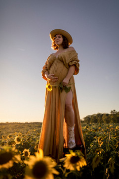 I had the perfect dress in my client closet to match the colors of the flowers, with the cutest cowboy boots. I envisioned bringing a stool out to the field and standing on it among the flowers shot from a low angle to exaggerate the size of the flowers and bring a unique perspective to the usual sunflower photos. I was convinced this was the perfect way to commemorate 20 weeks of growing my little one.